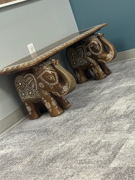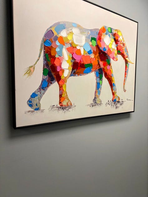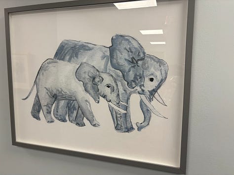 I started therapy this week. I wish I could go daily, but weekly will have to do for now. The moment I walked into the waiting room I noticed elephant décor everywhere. As my therapist led me back, we passed the exact elephant painting we have in our living room. It felt like a sign. Thank you to our good friend Lauren Brown for connecting me with this practice. (And babe, you promised me funky elephants!)
